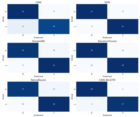 To provide a deeper comparative assessment, we visualized the confusion matrices of all baseline models, as shown in Figure 13. These visualizations clearly highlight disparities in false-positive and false-negative rates across the evaluated models. When compared with the confusion matrix of our proposed CNN–BiLSTM framework (Figure 10), it is evident that our model achieves superior classification accuracy with significantly fewer misclassifications. This performance advantage underscores the robustness and reliability of the proposed approach in accurately detecting Android malware, even under challenging conditions such as code obfuscation or previously unseen (zero-day) threats.