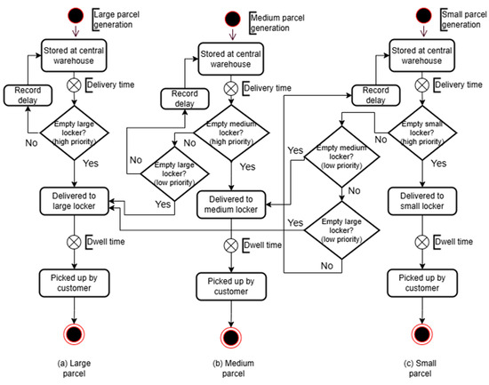 | Hold Medium Parcels | Hold | The medium parcels are stored at the central warehouse () until empty lockers are available. The delivery person controls the parcel releasing process () by calculating the number of empty medium lockers () or remaining empty large lockers () after the accommodation of large parcels. | |