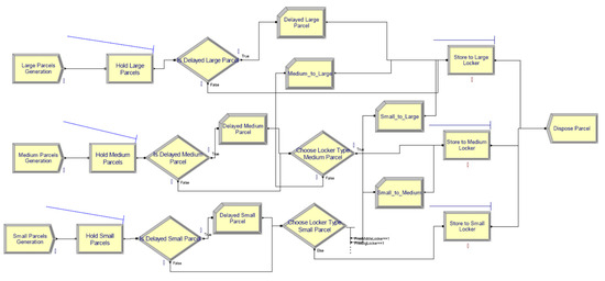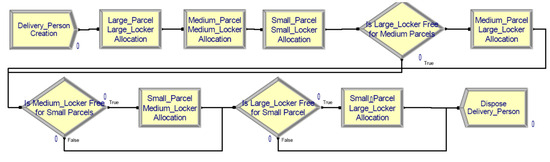 | Medium Parcel Large Locker Allocation | Signal | If there are free large lockers, a signal is emitted, and the module Hold Medium Parcels releases the adequate number of medium parcels to be delivered into large lockers (see Equation (7)). | |