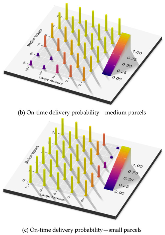 - Optimal locker configuration for service efficiency: Configuration of locker types significantly influences the system’s ability to maintain high customers service levels, as measured by on-time parcel delivery probabilities. The higher the customers’ satisfaction target, the smaller the number of feasible configurations. A small number of large lockers (typically ≥ 4 units for testing dataset) is essential to accommodate large parcels and prevent service degradation. While additional large lockers enable flexible storage of smaller parcels, they simultaneously reduce available capacity for medium and small lockers, creating a critical system design compromise.