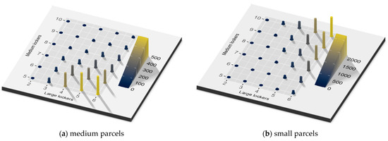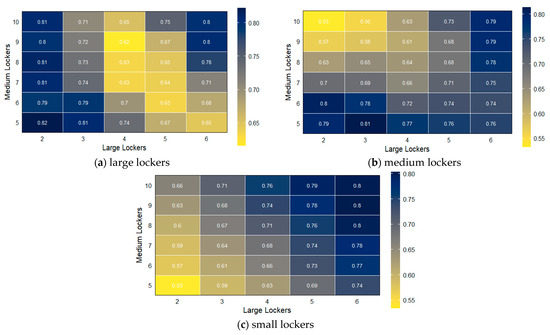 - Utilization patterns and spatial efficiency: While flexibility in locker allocation helps manage excess demand in some configurations, it may also create resource competition among parcel types. Large lockers show a central-to-peripheral utilization gradient, while medium and small lockers display bidirectional utilization gradients but in opposite trends. This nonlinear relationship underscores that optimal APLs configurations must balance absolute locker counts with their size-dependent functional interdependencies.