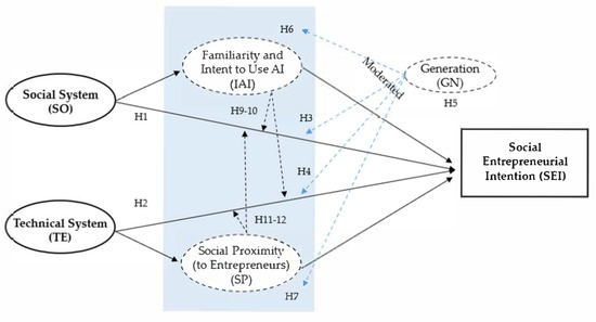 This study is based on Socio-Technical Systems Theory, which analyzes the impact of social systems (SO) and technical systems (TE) on Social Entrepreneurial Intention (SEI) [11]. The framework illustrates how various variables, such as generational differences, AI familiarity and usage intention (IAI), and social proximity (SP), moderate or mediate these relationships. In particular, each variable affects the formation of social entrepreneurial intention differently.