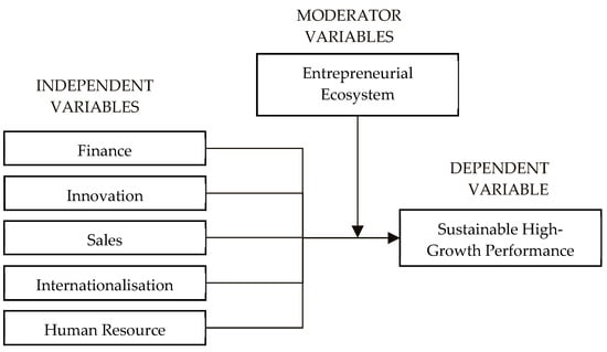 The business environment exerts a considerable influence on the performance of SMEs, manifesting in either a favourable or unfavourable manner, as evidenced by the research conducted by [112]. The findings demonstrate how entrepreneurs develop a diverse array of capabilities to capitalise on opportunities that emerge within the environment. However, ref. [113] have found that formal conditions in emerging markets for re-entry entrepreneurs are very limited and focused only on high-growth firms. However, as [114] have identified, there are other forms of benefits emerging within the entrepreneurial ecosystem. The aforementioned factors comprise professional expertise, support for incubators and accelerators, and business networking with research and development for investment in new products and services. The entrepreneurial environment is a complex system influenced by various factors, including culture, economy, society, the venture process, and gender [115]. As [8] observed, it plays a crucial role in fostering high-growth potential by maintaining competitive barriers through legal constraints and regulatory policies. Nonetheless, ref. [116] posited that, for high-growth enterprises, it is imperative to operate within a rapidly expanding industry as opposed to a stable one in order to attain superior liquidity ratios and foster heightened innovation. Ref. [117] posited that the exploitation of ideas within established firms is contingent on an entrepreneurial ecosystem that has the capacity to exert a positive or negative influence on the performance of SMEs during their high-growth process.
