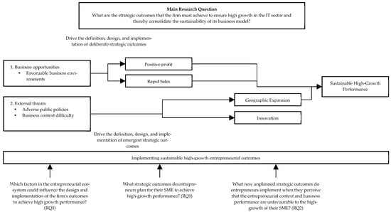 The multiple case study methodology culminates in a conceptual proposal using [21] logic model to identify cause–effect relationships in this complex phenomenon of identifying strategic outcomes for high growth. The initial step involves establishing a connection between the research objective, which is to ascertain the methods employed by IT entrepreneurs in developing strategic performance outcomes that ensure the sustainability of the high-growth business model. In a subsequent step, elements were identified from RQ1, RQ2, and RQ3 that would assist in answering the central objective of the research and that would adequately guide the results of the strategic outcome plan for high-growth SMEs. The logic model is also a visual map that can be used to infer patterns about the phenomenon under study [36]. This analytical technique, as proposed by [21], involves the empirical matching of events to predict an effect and can be employed in conjunction with the pattern matching technique. In this multiple case study, the logical model commences with an understanding of the intended and emergent strategic outcomes for high firm growth, which necessitates a set of factors inserted into the entrepreneurship ecosystem. The arrows thus represent the cause-effect sequence from the process of detecting business opportunities and external factors influencing the definition, design and implementation of deliberate and emergent outcomes for Sustainable High-Growth Performance. As illustrated in Figure 3, the logic model provides a visual representation of the sequence of events that influence SME creation.
