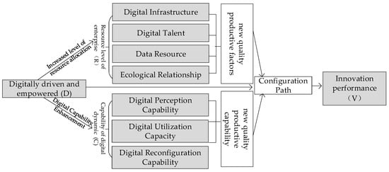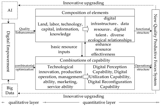 As the current wave of global technological revolution and industrial transformation deepens, innovation-driven development has emerged as a strategic pathway for achieving high-quality economic and social progress. In building a distinctly Chinese approach to modernization, the Chinese government has explicitly positioned high-quality development as a fundamental modernization requirement and emphasized innovation’s strategic role in supporting economic and social transformation. Consequently, the concept of “NewQuality Productive Forces (NQPF)” has been introduced, highlighting the pivotal role of original and disruptive technological innovation in promoting high-quality economic and social development [1,2]. In response to these new developmental imperatives, data elements, as transformative agents of new-quality elements (NQEs), have facilitated the reconstruction of traditional productive factors and organizational transformations and have emerged as the primary catalyst for advancing NQPFs [3]. By integrating human, machine, data, and physical resources, the new-quality productive model forms a “human–machine-digital” synergy system [4,5], which is essential for achieving competitive advantage and sustainable development [2]. As market entities responsible for constructing NQEs, enterprises must reconfigure their value creation logic amid the urgency and complexity of transformation and upgrading [6]. Building NQEs requires enterprises to achieve elemental and systemic synergy across dimensions of internal specialization, horizontal collaboration, and vertical coordination, placing higher demands on enterprises’ dynamic adaptive capabilities [5,7]. However, many SMEs experience digital divides due to inadequate assessment of their needs and capabilities during transformation processes [8]. Given this complex and evolving environment, understanding how enterprises can construct NQPF systems through digitalization has become a critical concern for both academic and practical communities.