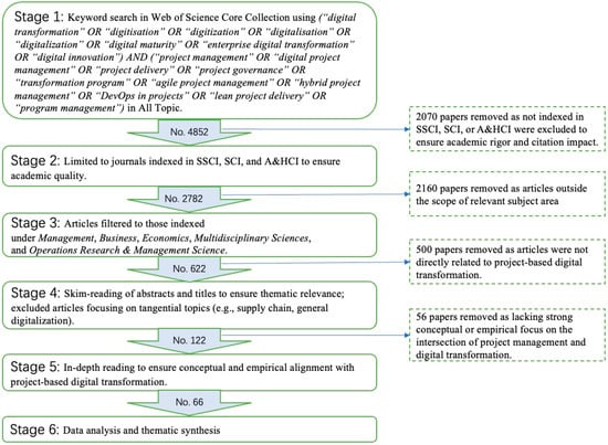 A close reading of the 122 shortlisted articles was undertaken to assess their conceptual and empirical contributions. We retained only those studies that explicitly addressed project-based DT and provided clear theoretical framing or substantive empirical evidence. Articles that exhibited vague or incidental project framing, limited conceptual grounding, or minimal relevance to the review’s thematic scope were excluded. Inclusion decisions were made through iterative discussion among the authors to ensure shared interpretation and consistency. This process resulted in a final sample of 66 articles for in-depth analysis. The final iteration of these criteria, along with the number of articles that remained after each iteration, is presented in Figure 1.