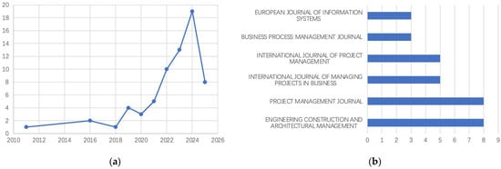 Figure 2a illustrates the annual publication trend from 2011 to 2025. A notable increase in scholarly output is observed after 2020, signalling an accelerated research focus on DT in project management. Figure 2b presents the leading journals contributing to this domain, revealing that the literature is anchored primarily in project management and information systems outlets, such as Project Management Journal, Engineering, Construction and Architectural Management, and the International Journal of Project Management.