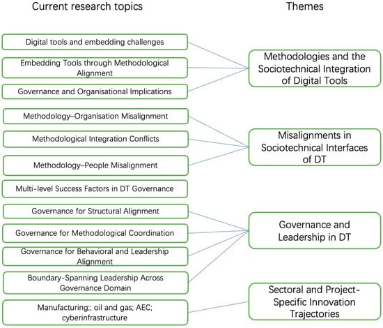 The themes not only highlight distinct areas within the literature but also contribute to the evolving understanding of DT as a sociotechnical phenomenon. In this context, STS theory offers a foundational lens, viewing DT as the product of dynamic interactions between technological systems, human actors, and organisational structures [24,25,26]. STS highlights that successful DT requires more than the deployment of tools–it depends on the effective integration of methodologies, people, organisational settings, and governance mechanisms.