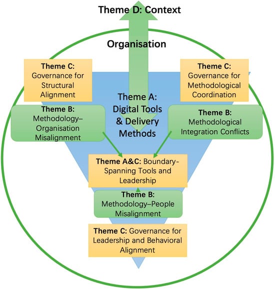 DT projects often encounter barriers not due to technological failure, but because of misalignments between methodologies, organisational systems, and human actors. Based on this review, three primary categories of friction can be observed: (1) misalignment between project methodologies and organisational structures, (2) integration conflicts across methodologies and planning logics, and (3) misalignment between methodologies and the behavioural, professional, or collaborative dynamics of people. These categories reflect critical sociotechnical interfaces that shape the outcomes of DT initiatives.