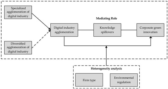 First, this study extends the industrial agglomeration literature by incorporating a digital perspective, emphasizing firm-level green innovation (CGI) rather than traditional regional innovation metrics, and empirically distinguishing the effects of specialized versus diversified agglomeration within the digital industry. Specifically, prior studies have primarily examined how industrial agglomeration influences regional-level green innovation [11,14]. However, research that explores its effect on CGI—particularly through the lens of DIA—remains relatively scarce [61]. The digital industry is a typical technology-intensive and knowledge-intensive industry, with its development and production processes fundamentally different from traditional manufacturing and service industries [7,26]. The objective of this research is to examine how DIA affects CGI, with a particular focus on distinguishing the effects of specialization and diversification agglomeration patterns at the firm level.