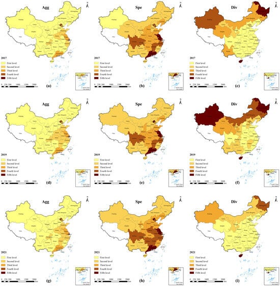 As China’s economic development does vary between regions, the agglomeration of digital industries may also vary across China [39]. Figure 2, based on a sample of 30 provinces, illustrates the levels of DIA in different regions. The three figures in the first column (a, d, g) depict the overall level of distribution of DIA (Agg). The three figures in the second column (b, e, h) show the geographic distribution of the level of specialization agglomeration of digital industries (Spe). Meanwhile, the three figures in the third column (c, f, i) depict the degree of digital industry diversification across regions (Div).