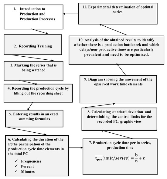 Contemporary PC optimizations are often deterministic, arbitrary, and sometimes subjective methods or special cases involving extensive mathematical calculations. Methods applicable in everyday factory use require a new approach that is as simple as possible, yet objective, justifiable, and consistent. The main stages and model steps are presented in Figure 1. The model is the result of our research and outlines the steps that need to be implemented. The process begins with familiarization with production and training for observation (Steps 1–2), followed by identifying the series under observation and recording data using a structured sheet (Steps 3–4). The recorded data are then entered into an Excel file for processing (Step 5), after which calculations are performed to determine the duration and share of various cycle elements in terms of frequency, percentage, and minutes (Step 6). Next, the average production cycle time per series is calculated (Step 7), along with the standard deviation and control limits (Step 7, second box). The results are visualized in a diagram showing the behavior of observed work time elements (Step 9) and analyzed for bottlenecks and non-productive time (Step 10). Finally, based on these insights, the optimal production series is experimentally determined (Step 11), closing the loop and allowing for process improvements.