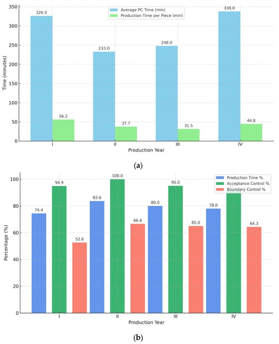 Figure 2a compares the average total PC time and the average production time per piece for each year (I–IV). It illustrates a noticeable reduction in both metrics in years II and III, indicating improved efficiency following process interventions. Figure 2b shows the percentage of TP, AC, and BC for each year. The highest production efficiency and control precision are observed in years II and III, as evidenced by high AC values and narrowed control ranges.