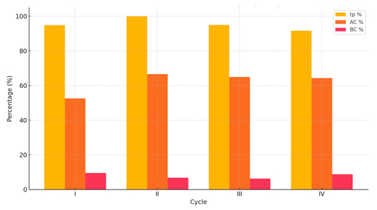 Figure 3 illustrates the production time percentage (tp %), acceptance control (AC %), and boundary control (BC %) across four production cycles (I–IV). Cycle II shows the highest production time efficiency (100%), while Cycle I has the highest BC % value, indicating a broader control limit. The AC % values are highest in Cycles II and III, showing more rigorous acceptance control in those cycles.