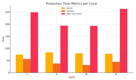 Figure 4 compares key time-based production metrics across four cycles (I–IV). Cycle II demonstrates the highest production efficiency (tp/min) and the shortest time per piece (tp/piece), indicating optimal performance. In contrast, Cycle IV has the highest total production time, suggesting a longer process duration despite moderate efficiency.
