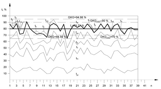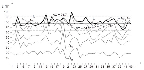 The results for screening PC during the first year (Figure 2a,b) show that the percentage of production time tpn mean value equals 74.35%, while the control limits are AC = 96.06% and BC = 52.64%. Figure 3 displays the trend of the longest time—technological machine tm, where it is noticeable that the process is also mastered and that the control limits are also set within narrow limits: CC = 24.4%, AC = 30.1%, and BC = 18.7%. The flow coefficient function for the first year is shown in Figure 4.