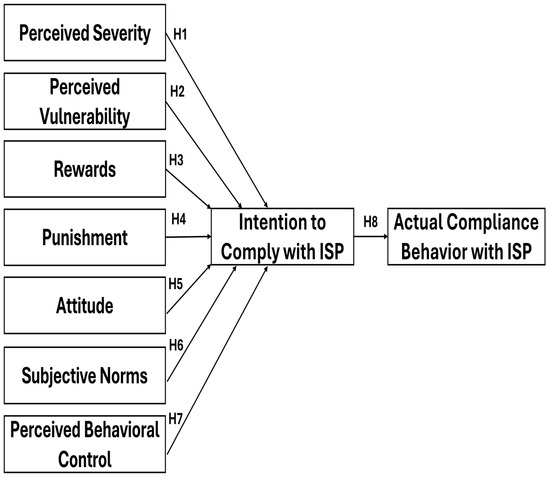 The integration of TPB enhances the pathway through which cognitive factors influence behavioral results. The model already includes intention to comply with ISPs as a mediating variable. The framework has received empirical support in ISP contexts. For instance, ref. [16] combined TPB and PMT and found that the constructs of the former significantly predicted employees’ intentions to follow security guidelines. Ref. [26] also showed the usefulness of TPB in assessing compliance with security policies, and that attitude and subjective norms are important predictors of behavioral intention.