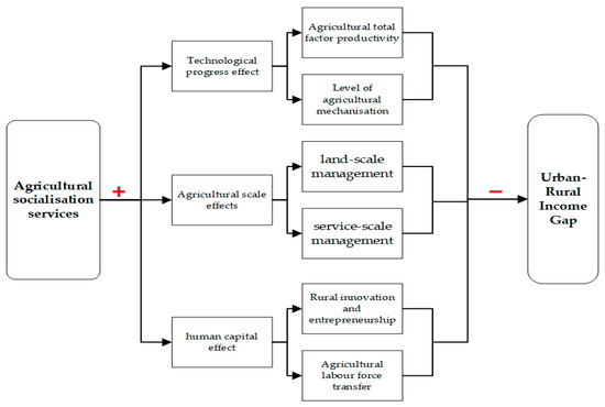The transmission mechanism of agricultural socialization services affects the income gap between urban and rural areas.