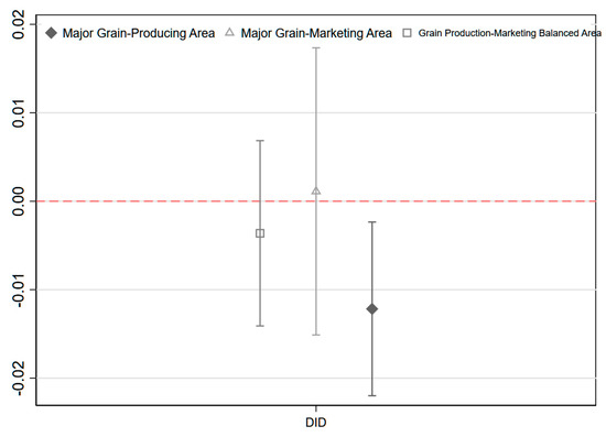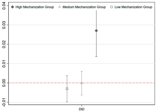 The degree to which agriculture is mechanized is a critical indicator of agricultural modernization and a prerequisite for the effective implementation of agricultural socialization services. This paper classifies samples into “high mechanization group”, “medium mechanization group”, and “low mechanization group” based on the median total power of agricultural machinery in order to further investigate the policy impacts of agricultural socialization services on varying mechanization bases. The regression coefficients for the impacts of each group on the urban-rural income gap are subsequently estimated. The regression coefficients of the effects of three groups on the urban-rural income gap are estimated in this study: the “high mechanization group”, “medium mechanization group”, and “low mechanization group”, which are named after the median total power of agricultural equipment. According to the data, socialization services do not substantially reduce the urban-rural gap in regions with low agricultural mechanization (the coefficient is 0.024, which fails the significance test). Indeed, there is a positive effect, which may indicate that the service system is not functioning effectively in the absence of the requisite infrastructure. Socialization services begin to reduce the income gap between urban and rural residents, particularly in highly mechanized regions, in the middle group (coefficient = 0.002) and the high group (coefficient = −0.001) (see in Table 11 and Figure 6). This is due to the fact that socialized agricultural services have a beneficial impact on the operation of agricultural apparatus, thereby increasing the efficiency of both agricultural production and factor allocation. This study further demonstrates that agricultural modernization infrastructure enhances the efficacy of policy.