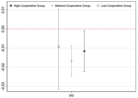The efficacy of socialization services in agriculture is significantly influenced by the scale and capabilities of service organizations. In addition to ensuring a consistent supply of services, professional co-ops that are operated by farmers also facilitate the integration of existing resources, the development of new technologies, and the exchange of knowledge. This paper employs the median number of farmers’ professional cooperatives in each province as a criterion for classification. Subsequently, the sample is divided into three categories: “high number of cooperatives”, “medium number of cooperatives”, and “low number of cooperatives”. The objective is to determine whether the efficacy of agricultural social services is influenced by variations in the number of cooperatives. Independently, regression estimates are conducted on the “high number of co-operatives” subsample, the “medium number of co-operatives” subsample, and the “low number of co-operatives” subsample. Agricultural socialization services have the most significant impact in regions with a low number of cooperatives, thereby reducing the income gap between urban and rural areas (coefficient = −0.022, p = 1%). Nevertheless, the impact of these services decreases as the number of cooperatives increases (coefficient = −0.017 in the intermediate group and −0.011 in the high group). −0.011, which is statistically significant despite being significantly less than zero (see in Table 10 and Figure 5). This could imply that agricultural socialization services, an alternative form of organization, may not have as significant an impact in regions with a small number of cooperatives. However, they still assist farmers by increasing their income, optimizing land utilization, and reducing the income gap between urban and rural areas. In contrast, regions with numerous cooperatives may experience lower policy returns and less efficient services as a result of potential duplication of resources and overlapping services.