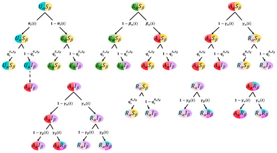 represent the probability that an individual in a hesitating state and a spreading state will take effective measures to prevent the spread of the disease, respectively. According to the transition probability tree shown in
