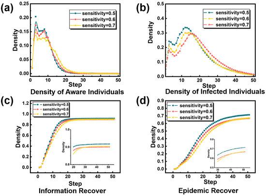 Figure 5c, showed that the psychological safety threshold of defensive behavior had no impact on the scope and breadth of information transmission. Information still spreads to a high level. To sum up, to enable individuals to effectively assess the level of disease around them, individuals can feel a moderate threat and take active and effective defense behaviors earlier, which can curb the spread of infectious diseases to a certain extent, but also have a certain inhibition effect on the spread of information, but the information will still spread in the end.