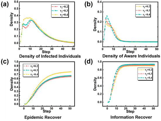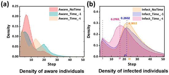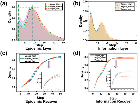 Figure 4a,b show the changes in node density at different states of the information layer and the disease layer, respectively. According to