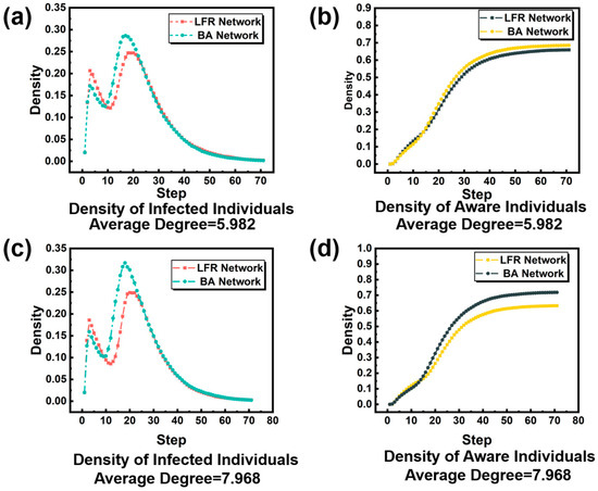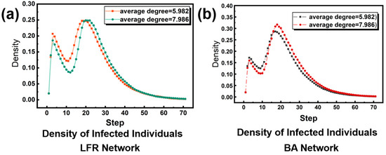 Figure 9b,d, it can be seen that under the same average degree, there is a significant difference in the final number of infected people between the two networks. BA network has more individuals infected and sick than LFR network, which may be due to the more obvious community structure in LFR network, and the closer the contact between individuals in the community, the faster the individuals will obtain information and take effective preventive measures, and finally control the infection scale.