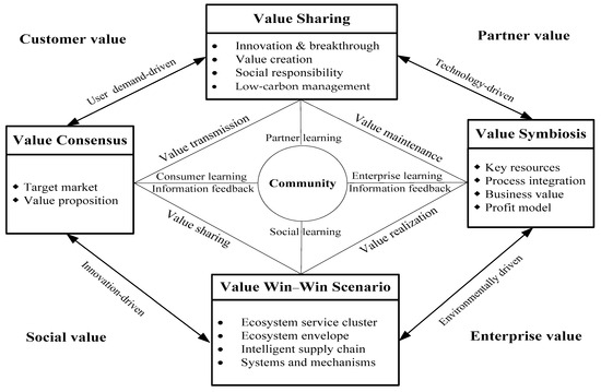 The value co-creation-based business model structure proposed in this paper has three main novel aspects: Firstly, in this model, the community is considered to be at the core of realizing value consensus, sharing, symbiosis, and win–win scenarios. The community can achieve value maintenance, transmission, sharing, and win–win scenarios through four forms of learning and feedback, namely consumer, enterprise, partner, and social learning.