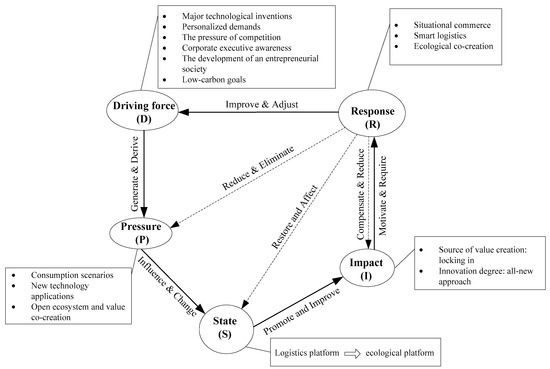 In order to solve the problem of strategic positioning in business model design, we introduce the DPSIR model to solve environmental problems. The DPSIR model (that is, the Driving Force–Pressure–State–Impact–Response model) was proposed by the European Environment Agency (EEA) and originally designed for the development of environmental policies. It is a framework used to describe environmental systems and their interrelationships with human activities. However, some scholars have improved the original DPSIR model to analyze the laws and phenomena of social and economic development. The improved DPSIR model also provides a relatively clear plan, method, and framework for solving system problems, thereby improving the efficiency of policy formulation and implementation for government managers and business owners. The uncertain environment referred to in this article refers to the economic and social environment in which logistics platforms and supply chain systems are located, and we have expanded the connotations of this phrase and the scope of the DPSIR model’s applications. Taking the ecological enterprise stage (i.e., stage four) as an example, the environmental mechanisms of RRS Logistics’ business model are shown in Figure 2.