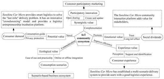 The customer value co-creation experience in virtual user environments includes practical, social, user-friendly, and pleasure-oriented experiences. A virtual community has many functions, including social support and recognition, information exchange, communication and entertainment, privacy and security, and equality and fairness. RRS Logistics regards its most important customers as “online employees” who engage in “zero-distance interaction” and operates the Internet of Things community ecosystem smoothly by providing experience, emotional, ecological, potential, and collaborative value. RRS Logistics’ Internet of Things community ecosystem based on value co-creation is shown in Figure 4.