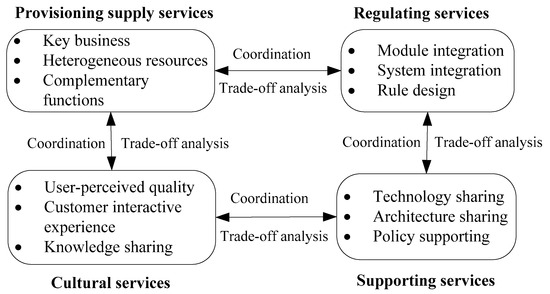 Figure 5 shows that the ecosystem service clusters are composed of provisioning, regulatory, supporting, and cultural services, with two main relationships of synergies and trade-offs between them. The provisioning services include the key business, heterogeneous resources, and complementary functions, while the regulatory services include module and system integration and standard design. The supporting services include technology and architecture sharing and policy support. Finally, the cultural services include the user-perceived quality, an interactive customer experience, and knowledge sharing. The four types of services are interrelated, forming a collaborative, balanced relationship and ultimately a closed ecological loop.