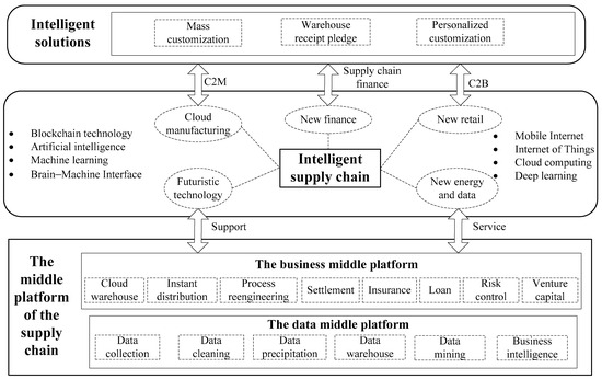 Figure 7 shows that the middle platform of the supply chain consists of the business and data middle platforms. The business middle platform comprises cloud warehouses, instant distribution, process reengineering, settlements, insurance, loans, risk control, and venture capital. The data middle platform comprises data collection, cleaning, precipitation, warehouses, and mining and business intelligence. The middle platform of the supply chain supports intelligent supply chain operation using futuristic technology and new energy or data [57]. In the future, the promotion and application of big data, artificial intelligence (AI), virtual reality (VR), and the Metaverse will provide more opportunities regarding supply chain technology [58]. In addition, it will provide intelligent solutions such as mass customization, the warehouse receipt pledge, and personalized customization in cloud manufacturing, new finance, and new retail through C2M, supply chain finance, and C2B, respectively.