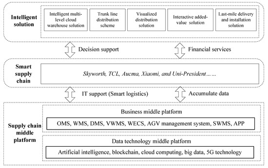 In a logistics platform, we need to establish a closed-loop logistics ecosystem based on the synergistic effects of various logistics nodes in the supply chain, such as manufacturers, suppliers, distributors, retailers, consumers, and vehicles. Moreover, the operation of this ecosystem cannot be separated from an intelligent supply chain. In other words, the most important factor for the smooth operation of a logistics platform system is an efficient supply chain. From a dynamic capability perspective, a nexus of multiple-system integration and business performance can be achieved through supply chain agility and flexibility [56]. An intelligent supply chain uses a combination of Internet and Internet of Things technology and modern supply chain management theories, methods, and technologies to build a set of intelligent, networked, and automated systems integrating the supply chains that connect enterprises and customers. With the development of the mobile Internet, Internet of Things, cloud computing, artificial intelligence, and deep learning, the middle platform of the intelligent supply chain supports its smooth operation and provides intelligent solutions. The middle platform performs a powerful core function and, finally, achieves the whole supply chain system’s innovation goal by means of an ecological transition. The design of the logistics platform is shown in Figure 7.