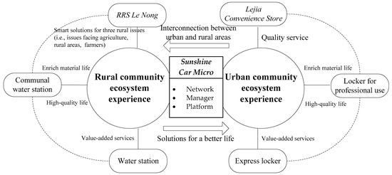 RRS Sunshine Car Micro has transitioned to a “three-store integration” community economy model with the help of cloud warehouse and distribution systems. It has utilized user interaction scenarios to transform their scattered demands into contextualized ones and established a community interaction platform to divert traffic and provide value-added services. It relies on the Internet of Things to connect express lockers in urban communities, water stations in rural areas, and the Sunshine Car Micro community, and has built a community user interaction platform with its core competitiveness stemming from its integrity. It offers friendly, personalized services and realizes the integration of logistics, an after-sales service, and a scenario-based business model. RRS Sunshine Car Micro’s scenario-based business platform is shown in Figure 9.