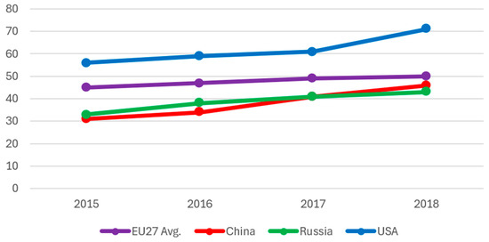 Across various AI-related indicators, the U.S. and China are clearly the top two leaders, while Russia does not even rank among the top 5–10. See, for example, the International Digital Economy and Society Index (I-DESI) [83], which compares the EU’s digital-economic performance with 18 other countries using 24 weighted indicators. According to the latest 2020 report, the U.S. leads by a wide margin, while Russia and China rank lowest, with similar scores (see Figure 2).