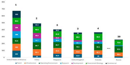 One more key AI ranking is the Tortoise Global AI Index (TGAII), which utilizes 111 indicators across seven areas, Talent, Infrastructure, Operating Environment, Research, Development, Government Strategy, and Commercial, to assess global AI leadership. In its fifth update (September 2024), the U.S. remains the clear leader, followed by China, while Russia ranks 31st out of 83, between Brazil and Estonia [84]. Based on earlier Tortoise data [85], Figure 3 shows scores from 1 to 100 for each country across the seven categories for each country. This highlights Russia’s lag, mainly due to relatively low R&D, talent, and commercial scores. Additional R&D funding data and patent trends support this finding.