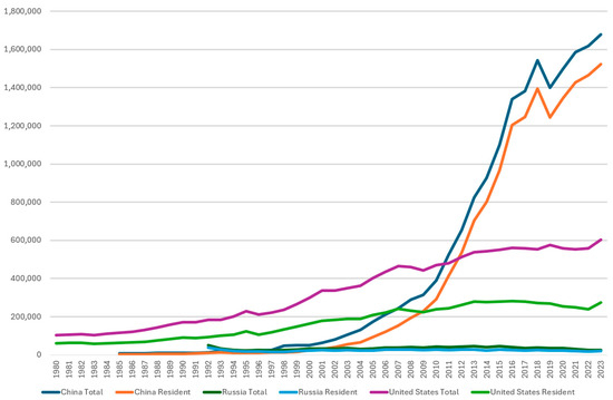 Another indicator of digital ecosystem vitality and leadership is the number of patent applications submitted, especially those by non-residents, which suggests the ecosystem’s attractiveness. Trends in patent applications from the WIPO database [88] (see Figure 4) reveal three key points. First, Russia consistently shows low patent activity. Second, China experienced significant growth since the early 2000s, surpassing the U.S. in the early 2010s. Third, in the U.S., non-resident patent applications make up over half of the total, highlighting America’s innovation strength in attracting global talent and intellectual property compared to China.