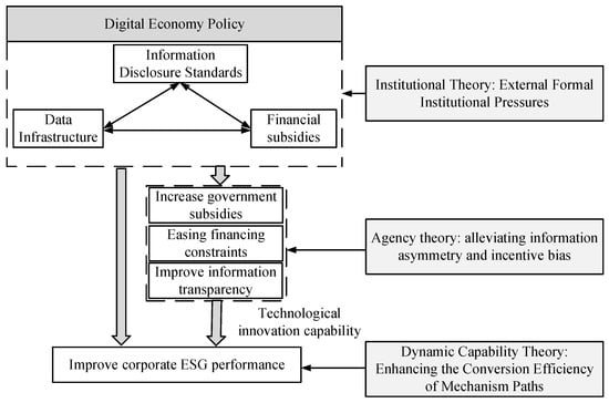 Together, these three theoretical frameworks construct a coherent logic chain of “institutional pressure-mechanism transmission-capability moderation.” This integrated model systematically explains the procedural mechanisms and boundary conditions through which digital economy policies affect corporate ESG performance, as depicted in Figure 2.