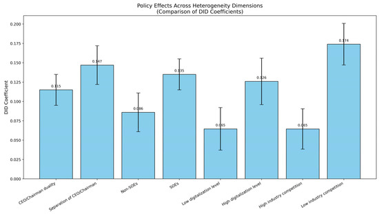 Third, disruptive technological innovation significantly amplifies the effects of digital economy policies via the transparency and financing channels, enhancing firms’ responsiveness to external institutional pressures; however, it does not exhibit synergy in the fiscal subsidy pathway. Additionally, heterogeneity tests indicate that firms with more independent governance structures (e.g., CEO–chair separation), state ownership, higher levels of digital transformation, and operation in low-competition industries experience stronger ESG improvements in response to the policy. This highlights the important moderating role of internal and external governance environments in shaping policy effectiveness.