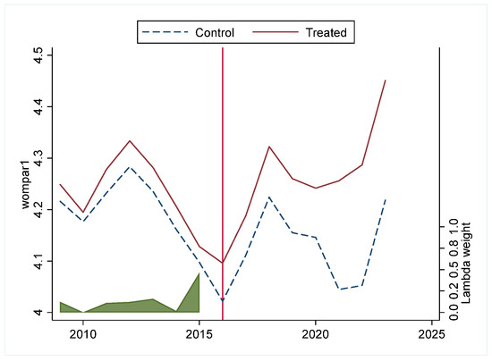 In this model, represents the ESG performance of firm i in year t. The variable is a treatment indicator, taking the value of 1 if the firm is located in a city covered by the national big data pilot zone policy, and 0 otherwise. The variable is a time dummy that equals 1 for years after the policy implementation (i.e., ), and 0 for years prior. The interaction term captures the net effect of the policy on corporate ESG performance, serving as the primary coefficient of interest. Control variables, denoted by , include firm-level characteristics such as size, profitability, capital structure, and regional fixed effects. accounts for firm fixed effects and year fixed effects, which control for time-invariant firm heterogeneity and common temporal shocks, respectively. Finally, represents the stochastic error term.