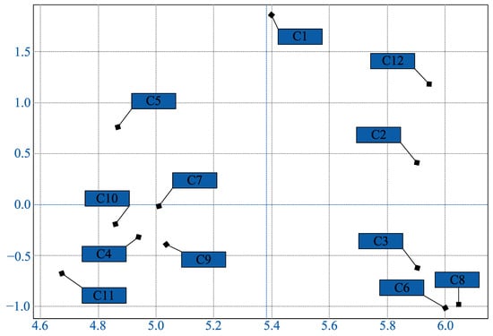 Table 6 presents a multi-criteria evaluation of twelve key success factors (C1 to C12), using metrics including influence, dependence, centrality, causality, weight, ranking, and attribute classification. These metrics collectively address the first research question (RQ1), by identifying which factors play dominant roles in shaping AI, big data, and blockchain-enabled urban carbon reduction strategies. Specifically, influence captures a factor’s outgoing impact on others, while dependence reflects its vulnerability to external drivers. Their combination—centrality—offers insights into which factors act as systemic hubs. This aligns with sustainability transitions theory, wherein central actors often shape regime shifts through technological and institutional leverage.