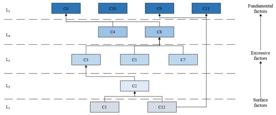 After applying the ISM method to perform a hierarchical analysis of the factors, the layered structure was obtained, as shown in Figure 5.