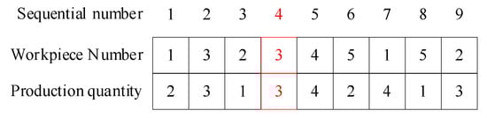 As shown in Figure 3, the above chromosome indicates that the production sequence of the production plan is 1->3->2->3…, producing 2, 3, 1, 4… pieces respectively. The highlighted positions indicate overloaded positions, meaning that the quantity of workpieces being processed exceeds the threshold, and some production tasks will have additional production time.