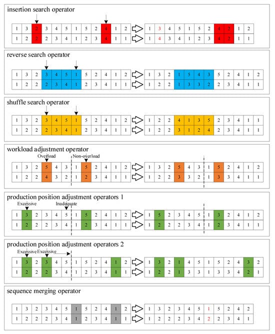 The workload adjustment operator, designed based on overload conditions, modifies production tasks in response to the overload status of workstations. The implementation proceeds as follows: (1) randomly select an overloaded position in the current solution; (2) identify potential positions capable of transferring the entire overloaded quantity; (3) if found, transfer the overload; otherwise, partially transfer the workload until reaching the position’s capacity limit. The above idea is reflected in the fourth part of Figure 4.