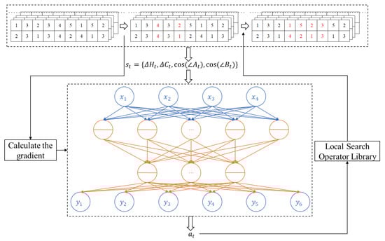 Previous research has extensively explored heuristic algorithm improvements. However, growing problem complexity and incomplete understanding of problem characteristics make heuristic design increasingly challenging [26]. Reinforcement learning offers potential solutions through environment-state-based action selection, though traditional Q-table implementations face limitations in terms of environmental definition and action space handling. Deep reinforcement learning overcomes these constraints by employing neural networks to support continuous environment representations. Building on these advances, this study develops a deep reinforcement learning-driven operator to enhance heuristic algorithms. The proposed operator dynamically collects and analyzes information about both search objects and population states during iterations, using these insights to intelligently select search operators. A schematic diagram of this approach is shown in Figure 5. The deep reinforcement learning-driven operator first obtains the network input on the basis of the population information of the current search target and then acquires the action values of each local search operator through forward propagation. A roulette wheel decision-making process is used to select the search operator on the basis of the current action values. The selected search operator is used to obtain a new population. Finally, on the basis of this new population, the effectiveness of the previous search operator is evaluated, and the gradient of the neural network is updated.