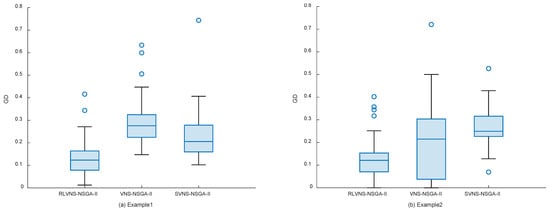 According to Table 5 and Figure 7, the proposed RLVNS-NSGA-II demonstrates better solving performance for most test cases: from both mean values and median distributions, RLVNS-NSGA-II’s results show smaller generational distances, and from the distributions of upper and lower quartiles, RLVNS-NSGA-II's results are all smaller than those of the other two algorithms. This metric indicates that RLVNS-NSGA-II has better convergence capability and stability than the other two algorithms.