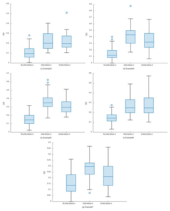 To evaluate the algorithm's performance in multi-objective optimization, the following metrics were selected: the number of nondominated solutions (), where larger values indicate more nondominated solutions in the results; the generational distance (), where smaller values indicate results closer to the Pareto front and convergence of solutions; and the hypervolume (), where larger values indicate better comprehensive performance. NSGA-II, VNS-NSGA-II improved by variable neighborhood search, and SVNS-NSGA-II with random variable neighborhood search were selected as comparison algorithms, with each algorithm running 40 times per test case. The comparison results of these metrics are shown in Table 4, Table 5 and Table 6 and Figure 7. The data for Example 1 to Example 7 are represented by (a) to (g) in Figure 7.