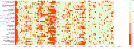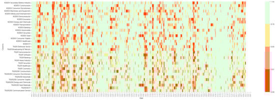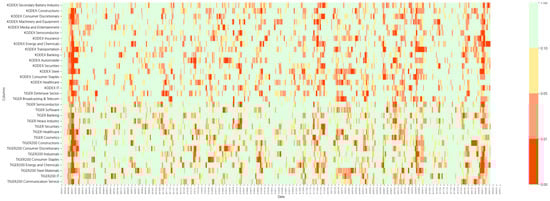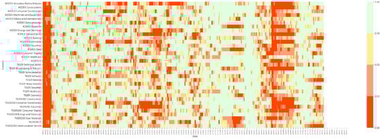 We analyze whether COVID-19-related exogenous variables (number of cases and deaths) have a causal effect on domestic sector ETFs using Granger causality tests. We empirically examine the impact of COVID-19 exogenous variables on domestic sector ETFs over different time windows. To examine the causal relationship between COVID-19-related exogenous variables—specifically, the number of confirmed cases and deaths—and domestic sector ETFs, Granger causality tests were conducted using time windows of 20, 40, 60, and 120 days (Choi & Kim, 2023) [24]. These varying windows were selected to capture short-, medium-, and long-term perspectives on the relationship. The tests were performed independently for each ETF, with the number of COVID-19 deaths and cases as exogenous variables. The F-test was used to calculate p-values for each lag, date, and ETF sector, and the optimal lag was determined based on the lowest p-value. Given that Granger causality relies on regression analysis, sufficient data points were required to construct an accurate regression matrix. To address potential limitations arising from insufficient data, the maximum lag was set at ⌊⌋ for each window size, balancing lag depth with statistical reliability.