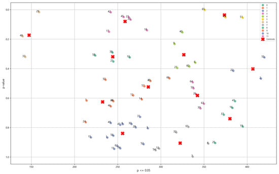 K-means clustering was employed to investigate whether sector ETFs, on which COVID-19 exogenous variables demonstrated statistically significant impacts in the ARIMAX model, also frequently recorded bins with significant p-values in the Granger causality test. The clustering results were visualized using a scatter plot to understand the relationships between these variables clearly. Table 6 explains the variables that were used in the scatter plot points in Figure 9.